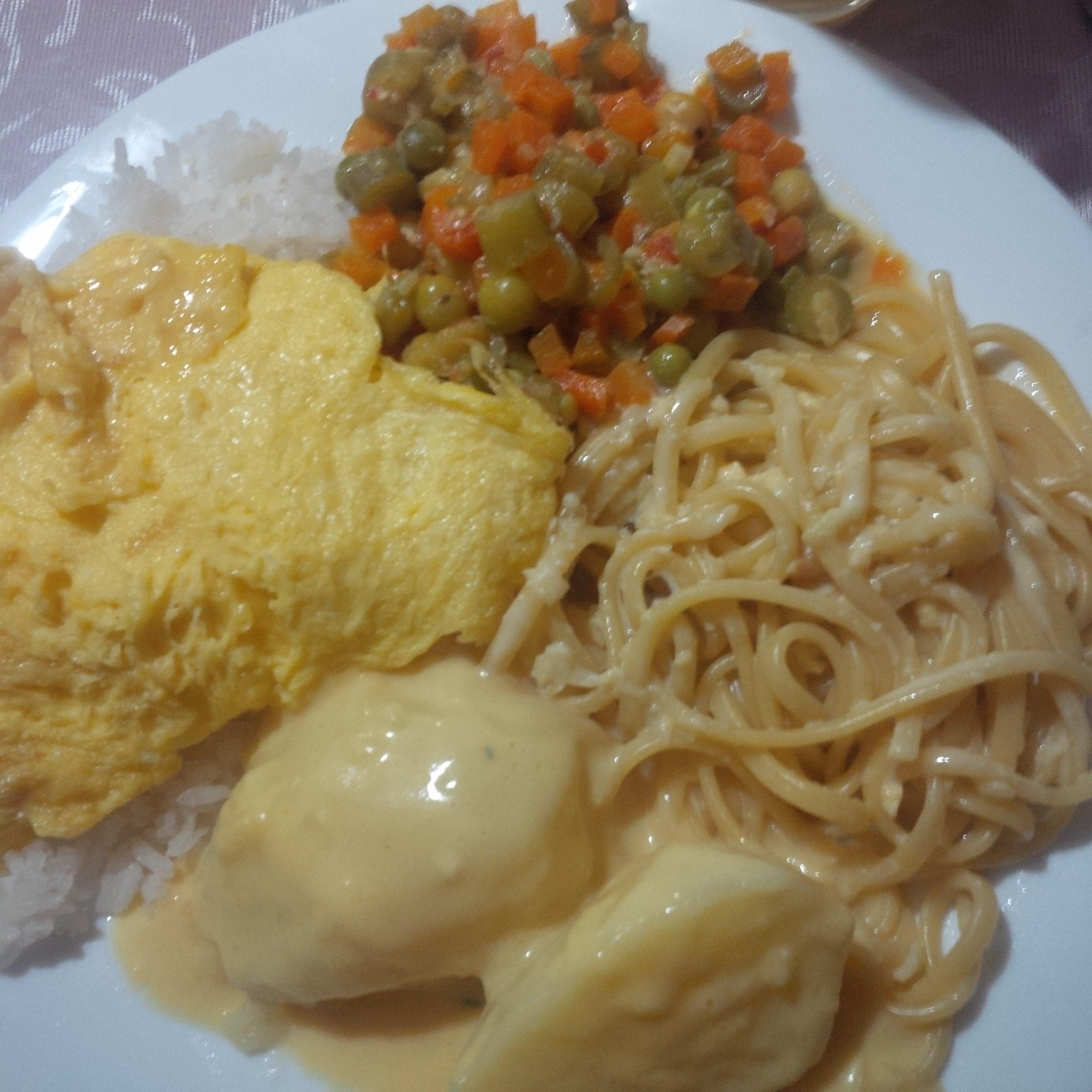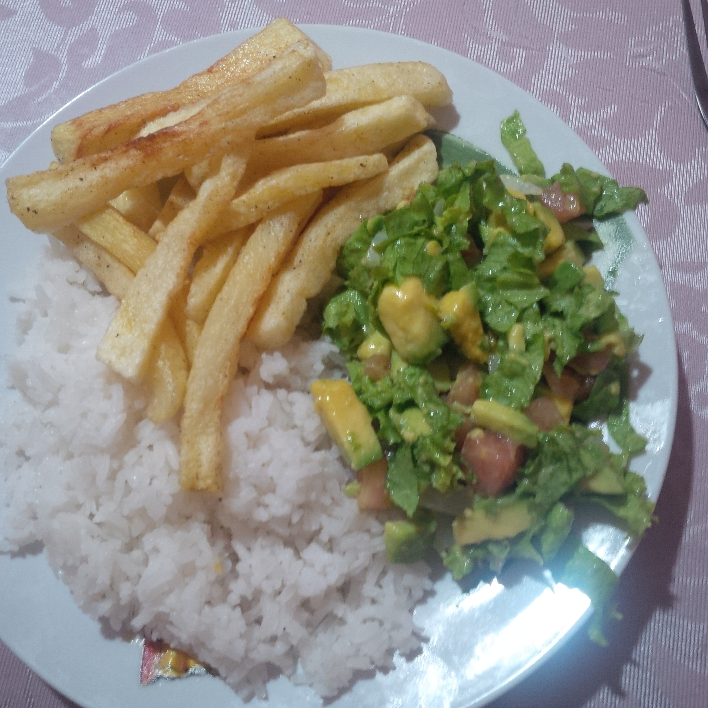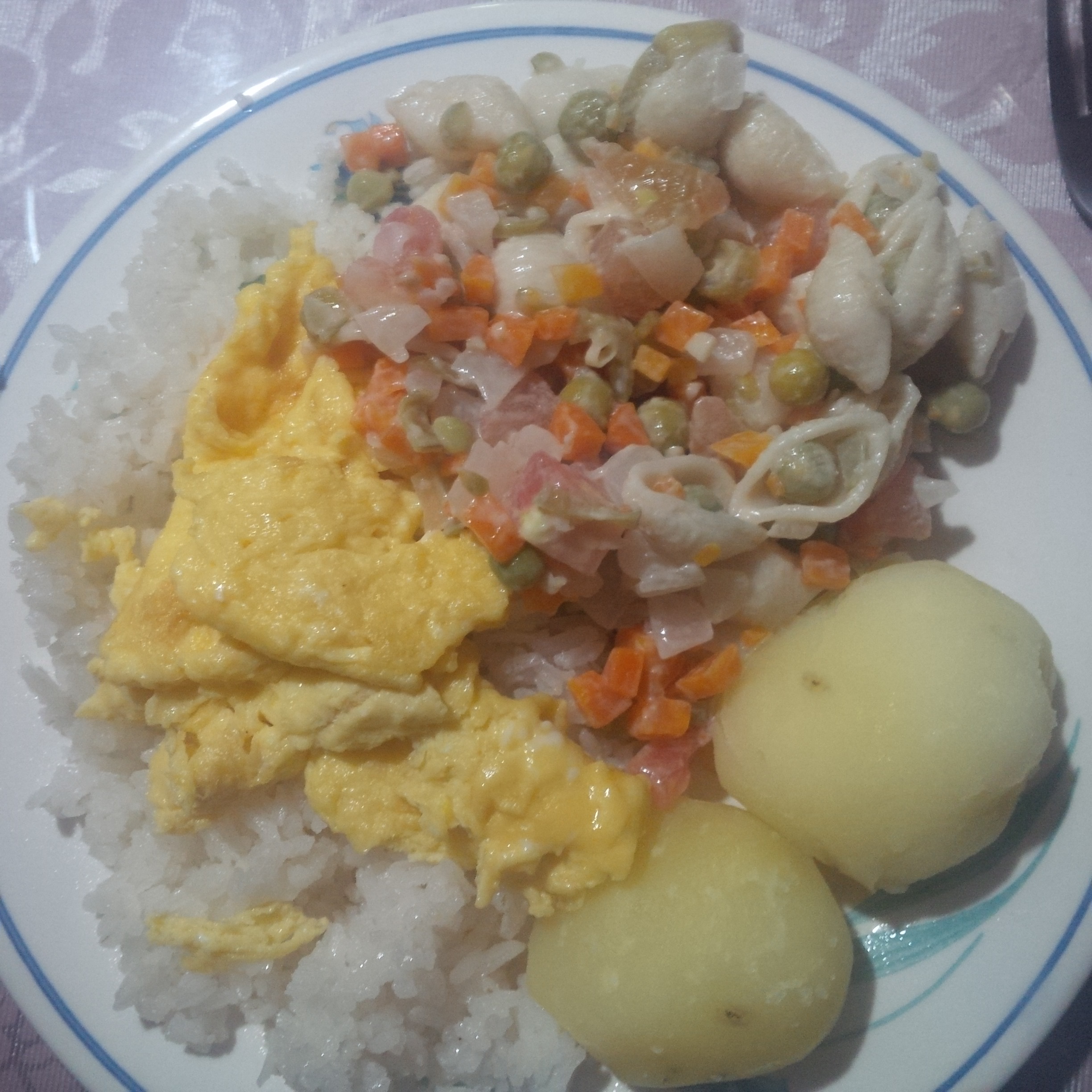Ich versuche mal das Essen kurz zusammenzufassen. Es gibt immer Reis, dazu Kartoffeln oder Nudeln oder beides, mit einem Gemüse. Das können frijoles, garbanzos o lentejas (Bohnen, Kichererbsen oder Linsen) sein (Bild 1 war meine Vorstellung vom typisch kolumbianischem Essen), ein Mix aus Erbsen und Möhren, die meine Gastmutter oft macht (Bild 2, 6) oder auch ganz oft ein ensalada (Salat), meist aus aguacate, lechuga, tomate y cebolla (Avocado, Salatblättern, Tomate und Zwiebel). Was es auch öfter gibt, ist ein Obstsalat. Aber nicht als Nachtisch, sondern das wird als Gemüse gegessen (Bild 5). So ein Obstsalat besteht zum Beispiel aus Salatblättern, Ananas, Rosinen und Käse oder aus Papaya, Mango, Banane und Apfel. Das erschien mir anfangs auch sehr merkwürdig, einen Obstsalat mit Kartoffeln und Reis zu essen 😀