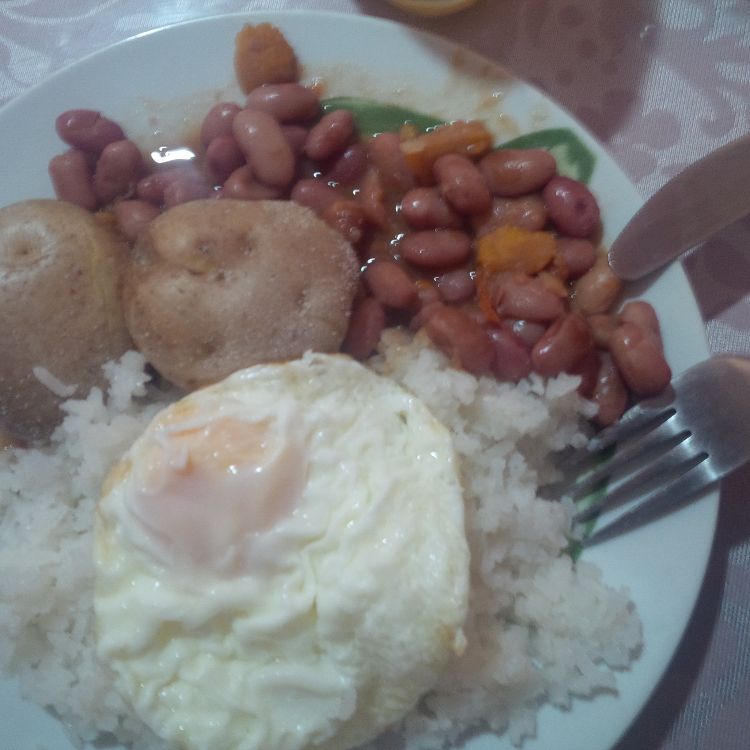 Ich versuche mal das Essen kurz zusammenzufassen. Es gibt immer Reis, dazu Kartoffeln oder Nudeln oder beides, mit einem Gemüse. Das können frijoles, garbanzos o lentejas (Bohnen, Kichererbsen oder Linsen) sein (Bild 1 war meine Vorstellung vom typisch kolumbianischem Essen), ein Mix aus Erbsen und Möhren, die meine Gastmutter oft macht (Bild 2, 6) oder auch ganz oft ein ensalada (Salat), meist aus aguacate, lechuga, tomate y cebolla (Avocado, Salatblättern, Tomate und Zwiebel). Was es auch öfter gibt, ist ein Obstsalat. Aber nicht als Nachtisch, sondern das wird als Gemüse gegessen (Bild 5). So ein Obstsalat besteht zum Beispiel aus Salatblättern, Ananas, Rosinen und Käse oder aus Papaya, Mango, Banane und Apfel. Das erschien mir anfangs auch sehr merkwürdig, einen Obstsalat mit Kartoffeln und Reis zu essen 😀