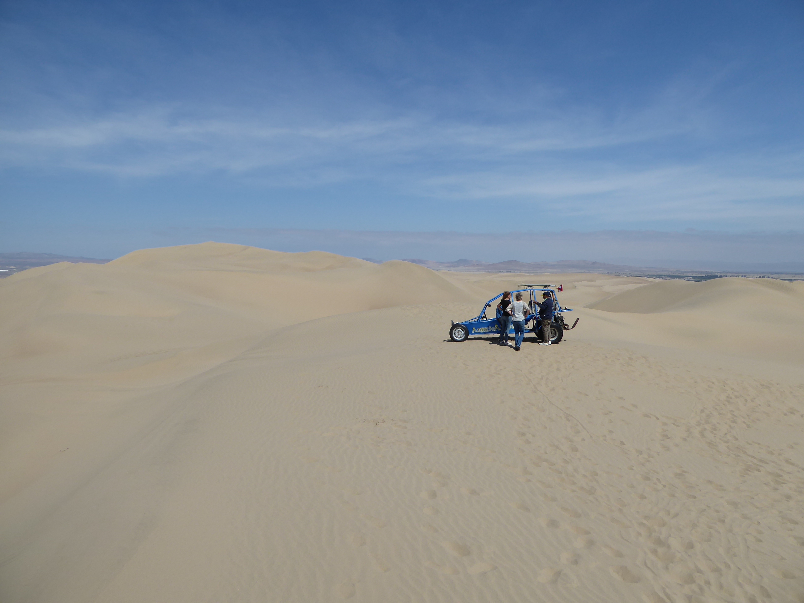 Zuerst hatten wir eine turbulente Buggytour, die eher einer Achterbahn glich. Mit mindestens 100 km/h sauste unser Fahrer und Guide mit einem klapprigen Gestell die steilen Sanddünen entlang. Das Beste: wir waren komplett alleine in der Wüste, soweit man blicken konnte! An einer Stelle hielten wir an und konnten so oft wir wollten (oft), die Sanddünen auf Brettern (am Ende auch ohne Bretter) runterrasen. Das war Adrenalin pur!