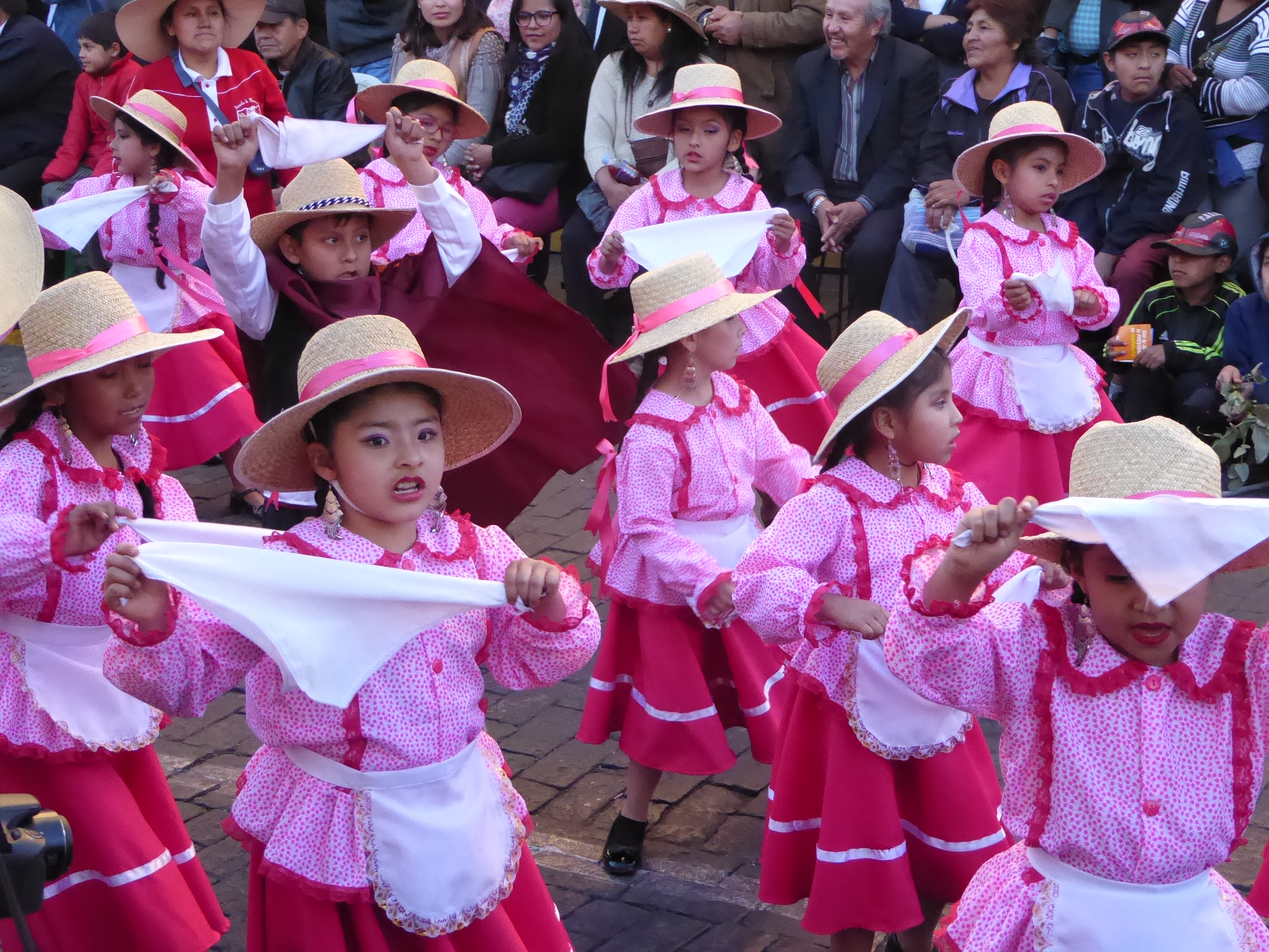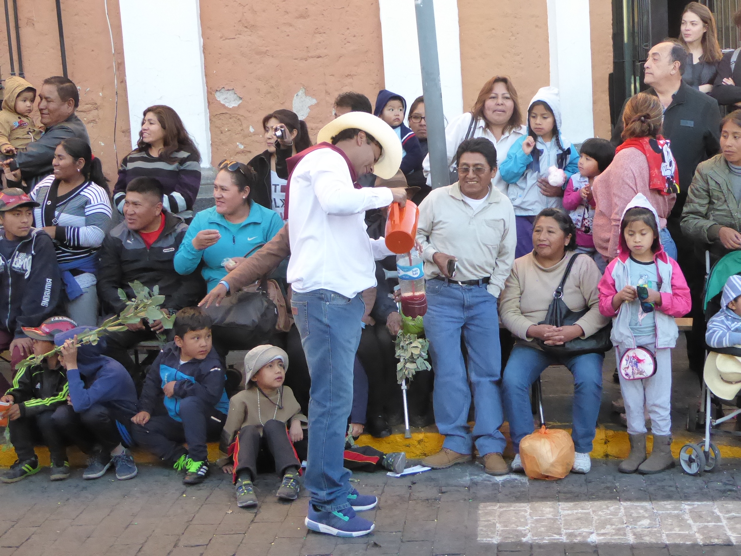 Zu der Zeit, als wir da waren, gab es in ganz Perú viele fiestas und Umzüge. Wir haben spontan einen miterlebt und die Peruaner haben ihre gute Laune und auf uns übertragen. Zwischen verschiedenen Gruppen traditioneller Tänzer mit lauter Musik, gab es kunterbunte Kostüme und Wagen mit viel Essen und Trinken. Das wurde großzügig unter den Schauenden verteilt. Tino war entsetzt, als an einem Wagen tote, gehäutete Meerschweinchen hingen. Das Bild erspare ich euch lieber.